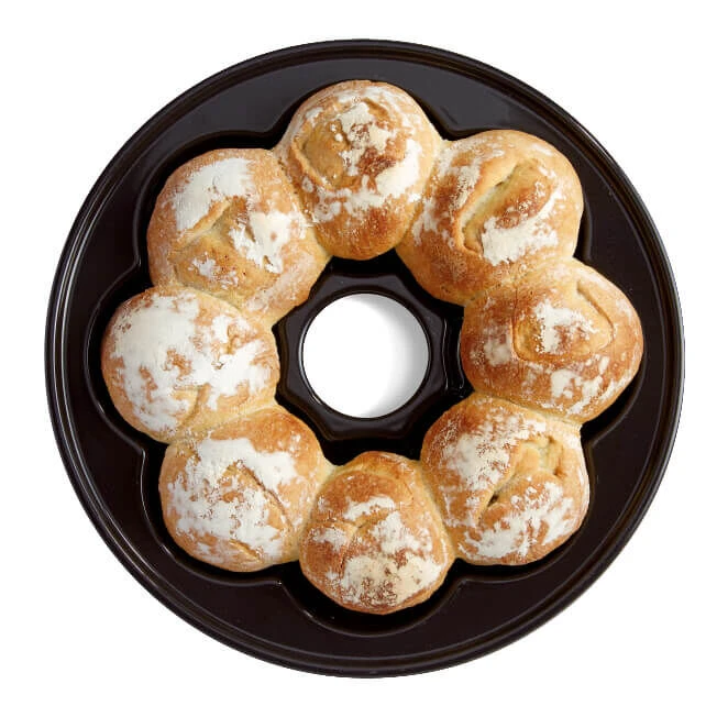 De Emile Henry kroonvormige broodbakpan is gemaakt van zwart geglazuurd aardewerk. De broodbakpan heeft een diameter van 30,5 cm. Dankzij het materiaal van de broodbakvorm bakt u brood met een krokante korst en een zachte binnenkant. Dankzij de bollen in kunt u eenvoudig 8 kleinere broodjes of brioches per keer bakken.