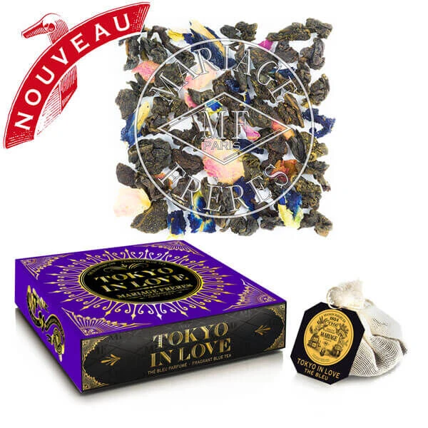Mariage Frères-thee komt in een zwart doosje met een inhoud van 30 zakjes thee. De Tokyo in Love is een bloemige blauwe thee met tonen van pruimen, kersenbloesem- en rozenblaadjes.
